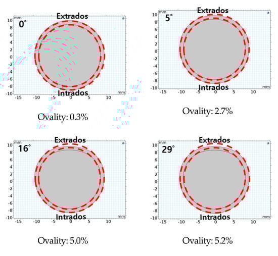 The three-dimensional images obtained were set up on the decomposition axis to obtain the cross-sectional geometry at the desired angle and location. When the steam generator heat pipe is U-shaped through the bending process, residual stress may exist, or the shape of the cross section may change during the bending process. To confirm the change in shape of the cross section, it can be directly cut and checked, but if the cutting is performed in the presence of residual stress, additional deformation may occur, which makes it difficult to measure the exact dimensions and to apply modeling analysis. The cross-sectional area of a row 1 heat tube was obtained using the cross-sectional axis data of the 3D image (Figure 2). The extrados shown in Figure 2 refer to the outside face of the tube, and the intrados refer to the inside face. The starting point of the left-hand side of the picture was considered to be 0 degrees, and the part corresponding to the outermost angle of the electric tube was considered to be 90 degrees.