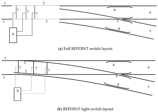 Different layout for full REPOINT and REPOINT-Light systems (a,b). Numbered elements: 1. Stock rails, 2. Movable switch rails, 3. Common crossing, 4. Check rails, 5. Divergent route, 6. Straight route, 7. Actuators with in-built lock and detection system, 8. POE (Point Operating Unit).