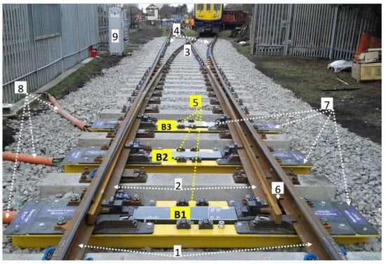 REPOINT-Light track switch at great central railway Quorn and Woodhouse station, UK: 1. Stock rails, 2. Movable switch rails, 3. Common crossing, 4. Check rails, 5. Actuator bearer with locking elements, 6. Rail detection sensors, 7. Bearer coves, 8. Connections between the control unit and bearer elements, 9. Control unit.
