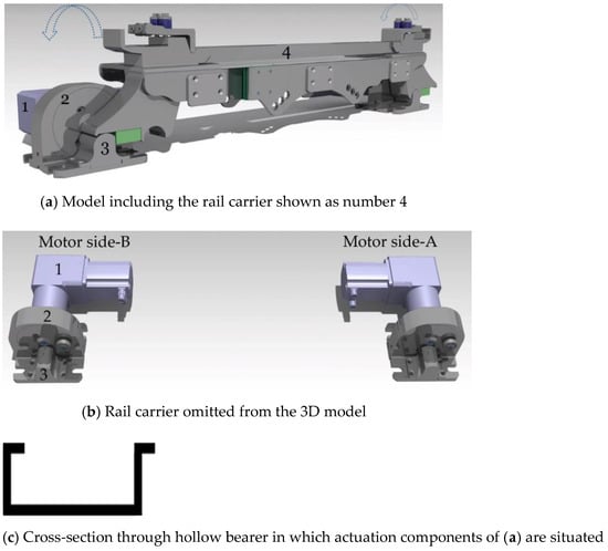 The experimental switch panel can be seen in Figure 2. It is driven by three functionally identical (yellow) actuator bearers; otherwise, it is a conventional switch panel installed on concrete sleepers (note that, other sleepers could be used if desired). Each steel hollow actuator bearer, B1, B2 and B3, houses two identical sets of servo motors, bevel gearboxes, cams, sensors and locking elements, as shown and labelled in the 3D models of Figure 3.