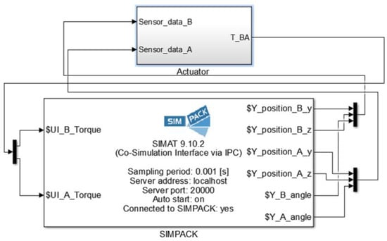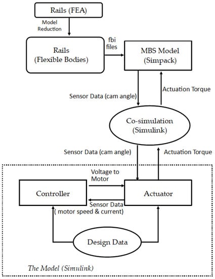 These finite element bodies of the switch and stock rails are then converted into flexible body files (.fbi files) using the model reduction technique in Abaqus. An MBS model of the switch panel is then developed using Simpack. This MBS model is then connected to the actuator model developed in Simulink to form a co-simulation in Simulink as shown in Figure 7. This co-simulation is constructed so that the designed controller, which will be explained in the following section, can be connected to the MBS as shown in Figure 4. The sensor data are fed to the actuator and controller modelled in Simpack and the actuation torque is fed to the MBS model. The data exchange between Simulink and Simpack in the co-simulation environment is carried out at a fixed time step of 0.001 s.