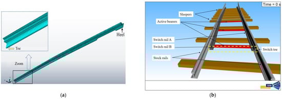 (a) Finite Element (FE) model of switch rails, (b) Multibody Simulation (MBS) model of the switch panel in Simpack.