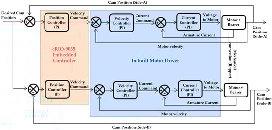 The control performance and stability requirements for the system shown in Table 2. The maximum current is considered in the design process, but in practice is limited automatically by the motor drivers. The phase and gain margin requirements of 6 dB and 60° are essential to ensure robust relative stability of the system in the presence of uncertainties. The settling time requirement is set to be less than 7 s to comply with the UK railway switching time norms. The maximum allowable overshoot is specified is as 2° to ensure that the cams do not over-rotate during transit. This is a very large margin of error which ensures that the cam will not touch other mechanical components by over-rotating. For each active bearer, the two cam control systems are supplied with the desired cam angle as their setpoint (see Figure 8). The feedback signal from the cam encoders is used in controlling the motion of both motors such that the switch rails reach their expected position, Reverse or Normal, as commended by the set-point angle (0° or 180°, respectively).