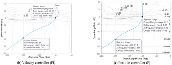 The Nichols plots generated as part of the controller design process are shown in Figure 9; it is clear that the control stability margin requirements are met. The current controller Nichols plot (see Figure 9a) shows an infinite gain margin and phase margin of 90.2° which are well above the requirement. The middle loop is then analysed in the same manner to generate gains for the velocity controller. The Nichols plot in Figure 9b, shows the gain and phase margins to be 57 dB and 90.6°, respectively. Once again these margins are large compared to the control requirements, but the time responses are sufficiently fast that it is not necessary to use higher gains. The outer position loop controller is designed last and the corresponding Nichols plot is shown in Figure 9c. The gain and phase margins are 61.5 dB and 88.6°, respectively, which again more than satisfy the control requirement shown in Table 2. The high margins ensure the stability of the system even in the potential event of high gain and phase modelling errors/uncertainties; which give confidence that the closed-loop systems on the real switch will be stable and behave according to requirements. The time-response simulation results, which were checked at each design step and are shown for the final design later (in Section 4.3) predict a rise time of around 2.5 s and a settling time of approximately 5 s when operated with a single actuator bearer.