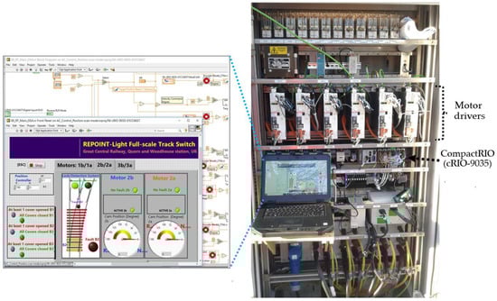 A number of different railway working conditions are considered during the design process of the full system. Figure 10 shows the internals of the track switch control cabinet (shown as 9 in Figure 2) and both the front panel and the block diagram windows of the controllers’ code developed using the NI-LabVIEW software to drive the six servo motor drives of the track switch. From the front panel window, the operator can check the state of the switch by both the position (angles) of each cam encoder and the indication from the detection system. The operator can change the current track-switch state to either Normal (0°) or Reverse (180°) positions from an exterior electrical toggle-switch.