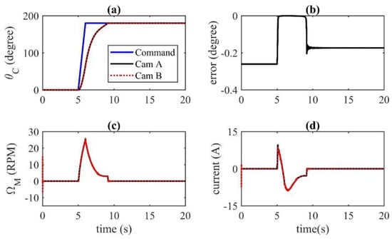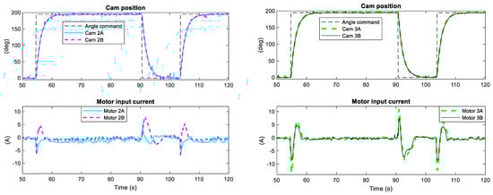 Comparison of performances for both the cams within the actuator: (a) angular position of the cams; (b) error in the angular position between the cams; (c) motor angular velocities; (d) motor input currents.