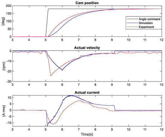 The experimental results from the implemented system are presented along-side the simulation results and used to validate the co-simulation model. The validation results with one active bearer (the third bearer (B3) in Figure 2) are presented in Figure 12. The results with a step-change in command from 0° to 180° shows that the cam rotates as desired. The 0° corresponding to the cam position that places the switch rails in the Normal position, whereas the 180° is reached by the cam when the switch rails are placed in the Reverse position. In the cam angle plot in Figure 12, the result from the co-simulation is shown with cam sensor data from the experiment and it shows a good agreement apart from the small difference in the start-up phase of the plot. The cam angle sensor data from the experiment shows that the cam settles at an angle of 180°, which is perfect because the hoppers carrying the switch rails rest on the locking block before the full 180° rotation. The other two data which are available from the experiment are the motor angular velocity and motor input current which are also shown to agree with those from the co-simulation result in Figure 12. It is seen from Figure 12 that the control requirements are satisfied such as settling time (4.8 s), maximum motor current (<10.4 A) and maximum overshoot (0°).
