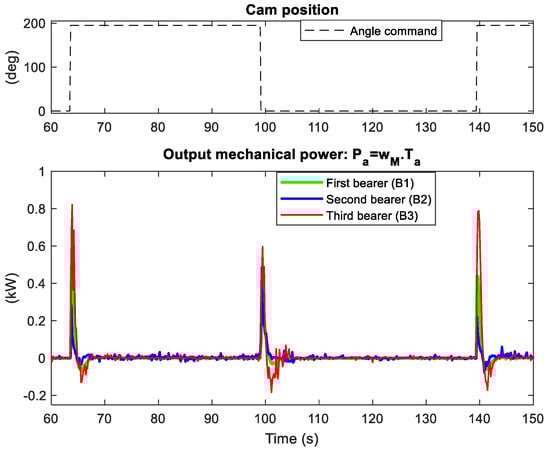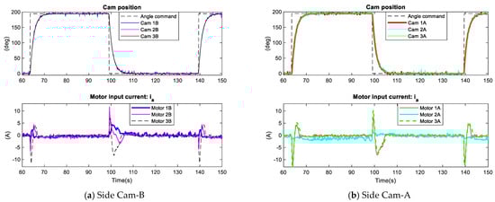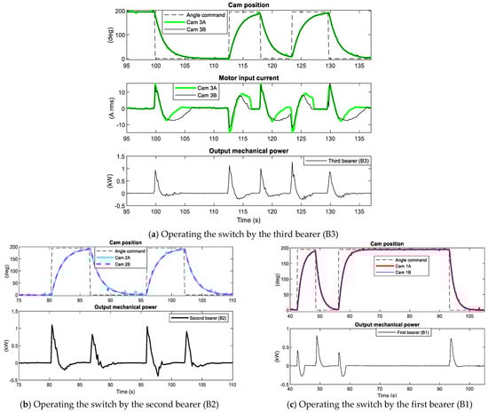 Here, the switching is achieved by running an individual bearer, B3 then B2 and finally B1. Thus, in this operation scenario, it is considered that the other two bearers are not working. The results showing cam position, current and power are shown in Figure 17a for B3; whilst summary results for B2 and B1 are provided in Figure 17b,c, respectively. In each case, it is seen that synchronous motion of two motors in each bearer, side-A and side-B, is achieved and the step response requirements (see Table 2) are still met. In Figure 17a, it is seen that the motor currents are not identical. This must be caused by uncertainty from mechanical asymmetry causing different loading on the motors. Even in this extreme case (of only one operational actuator), the maximum input current drawn from all motors is less than 20A, which is also within the requirements without needing recourse to the driver current limit.