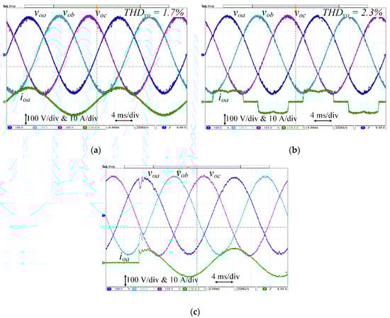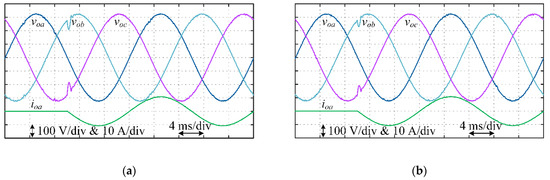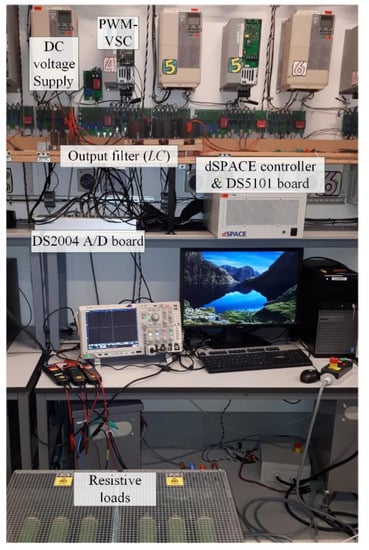 The experimental setup in Figure 2 was prepared to check the theoretical analysis. The laboratory setup includes a three-phase 5 kW VSI, a three-phase resistive load, and an LC-type output filter. The DS1007 dSPACE system platform is also employed to drive the VSI and realize both control methods. Moreover, to generate switching pulses and digitalize the measured currents and voltages, a DS5101 digital waveform output board and an Analog-to-Digital DS2004 board are used, respectively. The parameters of three-phase LC-filtered VSI are given in Table 1.