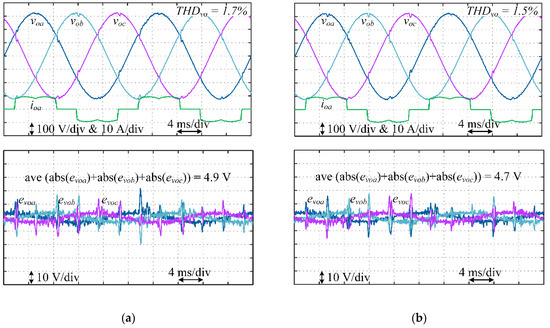 Simulation results showing steady-state performance under nominal linear load (5 kW), (a) the proposed adaptive MPC, (b) conventional MPC.