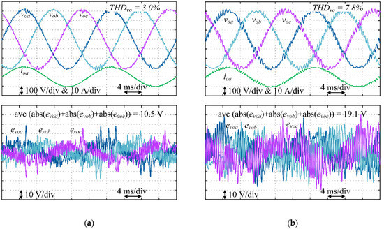 Nowadays, three-phase inductor and capacitor (LC)-filtered voltage source inverters (VSIs) have found widespread applications in renewable energy resources, such as alternating current (AC) microgrids, distributed generation systems, energy storage systems, and uninterruptible power supplies, to produce a stable sinusoidal output voltage of the desired magnitude and frequency under different load conditions [1,2,3,4,5,6]. Several high-performance control schemes have been reported to meet this goal, including proportional–integral (PI) and proportional–resonant (PR) control methods [5,6,7,8,9,10], model predictive control (MPC) method [1,2,3,11,12,13], sliding mode control (SMC) method [14,15,16,17], and adaptive control methods [4,5,18,19,20].