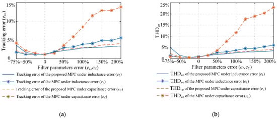 Simulation results showing robustness analysis of the proposed adaptive MPC and conventional MPC against the filter parameters uncertainties, (a) voltage tracking error, (b) total harmonic distortion (THDvo).