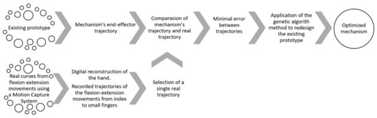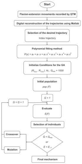 Three types of formulation applied to mechanism synthesis problems can be found in the literature: function generation, trajectory generation, and body guidance [45]. This article focused on trajectory generation based on an optimization process. An optimal mechanism to generate the desired trajectory followed by the fingertip was found. The data from the real finger trajectory, described in the previous section, was used in the computation of the objective function. This allowed us to find the optimal parameter of the solution to reconfigure the existing rehabilitation mechanism. The optimization problem was solved using the genetic algorithm method.
