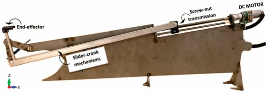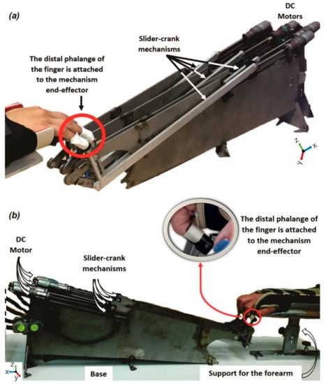 A prototype for assisting flexion–extension movements from the index to small fingers was proposed in 2016 [34]. The prototype consisted of four parallel mounted slider-crank mechanisms (one for each finger), driven by a direct current (DC) motor and a screw-nut transmission, as shown in Figure 3. The end-effector, located in the coupler link, was the contact point between the prototype and the fingertip. The fingertip was attached to the end-effector using an articulated thimble placed at the extremity and was fixed with adhesive fabric. Figure 4 shows how the arm and fingertip are positioned on the mechanism.