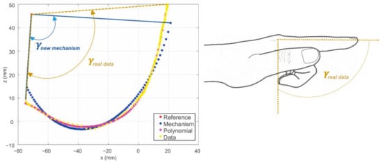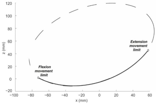 The shape and amplitude of the flexion–extension trajectory had to be considered to design a better mechanism. This is because the mechanism must be able to adjust the range of motion for different flexion–extension amplitudes. Since the optimized mechanism’s configuration is an end-effector, it allows for the extrapolation of the result obtained for use with different subjects. The flexion–extension movement is not affected since the trace is at the fingertip.