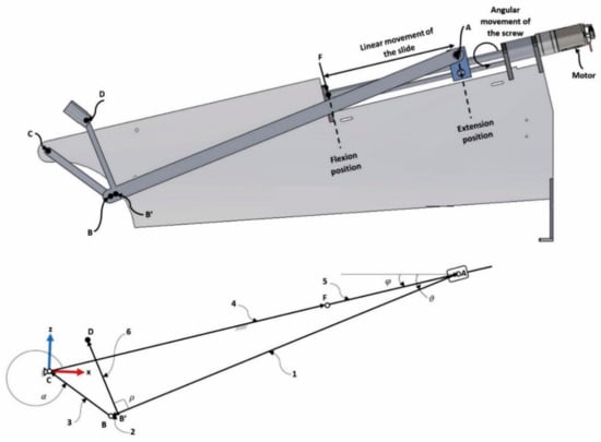 Vector 4 represents the physical distance between points C and F. Point F represents the minimum position of flexion movement. Point D is the contact point between the patient and the device and describes the elliptical trajectory that was mentioned before. Point D could be considered as a rigid body attached to the AB link and has an angle with respect to AB. Angle represents the inclination angle of the mechanism. In the original prototype, degrees and degrees.