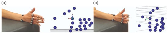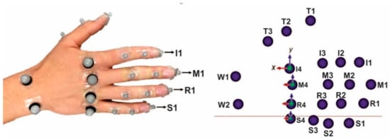 A set of 21 markers was used and installed on the right hand of each volunteer. Table 2 describes each marker’s location and the label that was used to reconstruct the hand in digital form. The digital reconstruction of the hand is shown in Figure 8. The digital reconstruction was based on marker locations following the anatomy of the subject.