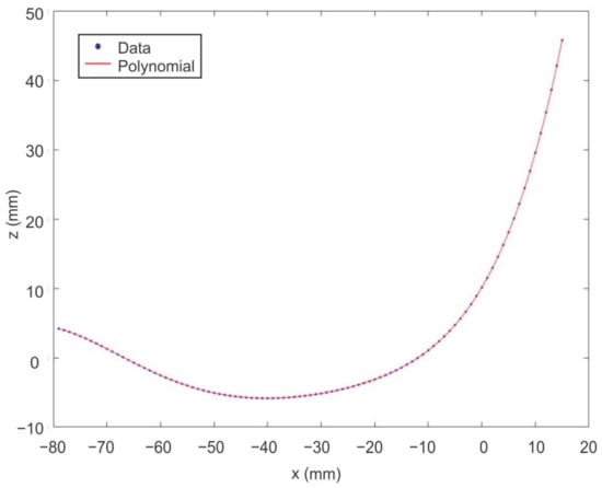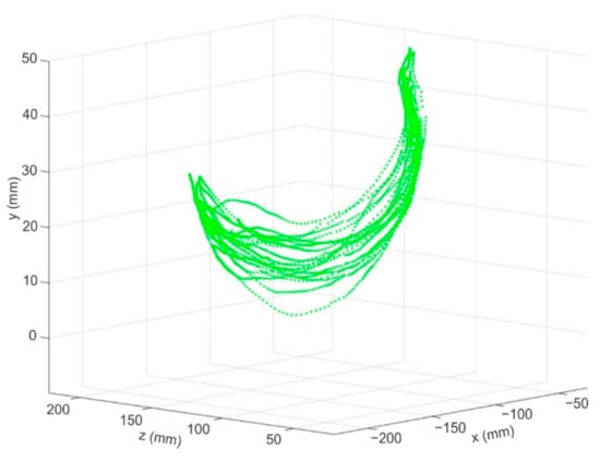 The recorded gesture focused on the flexion–extension movement leading to the fingertip trajectory. This finger movement occurs in the finger plane, which is normal to all joint axes. Consequently, the fingertip trajectory were defined only by the x and z coordinates (as shown in Figure 10). A series of three-dimensional curves, as shown in Figure 11, was obtained using the flexion–extension movement in the xyz space, which corresponded to the recorded motion for a volunteer’s index finger.