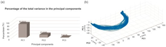 As can be observed in Table 3, the first two components explained 99.39% of all variability, as shown in Figure 12. This proves that the y-axis presents a reduced variation in the flexion–extension movement of the fingers. Due to this, one can conclude that the flexion–extension movement can be assumed in the xz plane. The abduction–adduction movement of the finger was not considered.