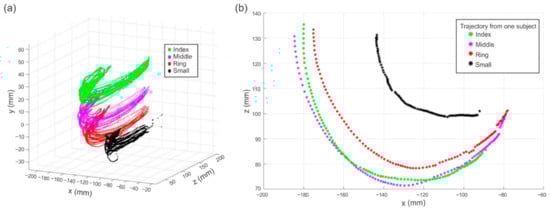The finger motion, from the index to small, was analyzed. A similarity was observed between all fingertip trajectories, as shown in Figure 13a. An example of graphs obtained for all fingers of one subject is depicted in Figure 13b. The left side of Figure 14 shows all the trajectories recorded in the xyz space. The right side shows one movement in the xz plane to improve the visualization of each finger’s trajectories.