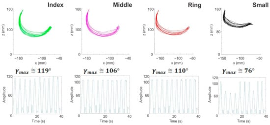As can be observed from Figure 14, the trajectories for the different fingers were similar in shape but with different maximum angle () amplitudes. Table 4 shows the values of the angles of movement among the volunteers after several tests.