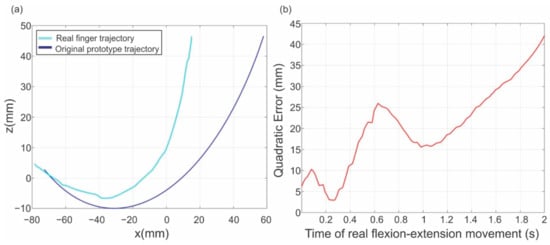 (a) Real finger trajectory and the trajectory of the end-effector prototype. (b) The quadratic error between trajectories.