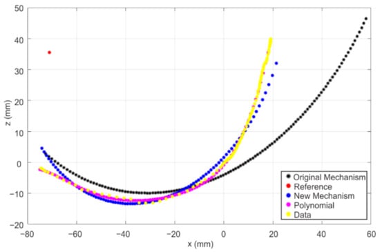 Concerning the angle of motion , a difference of 2.5 degrees was found between the real trajectory and the end-effector’s trajectory of the new mechanism (as is shown in Figure 22).