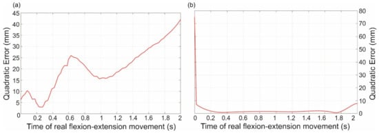 It seems feasible that the prototype trajectory follows the real trajectory more closely. Figure 15b shows the quadratic error between the two trajectories. It can be noticed that this error was not negligible and the error was used as an optimization criterion. The end-effector, located at the fingertip, was required to follow a specified curve with a minimum error computed between the obtained and desired trajectories.