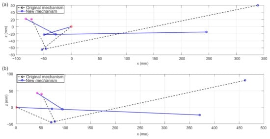 Comparison between the two mechanisms in their extreme positions: (a) flexion and (b) extension.