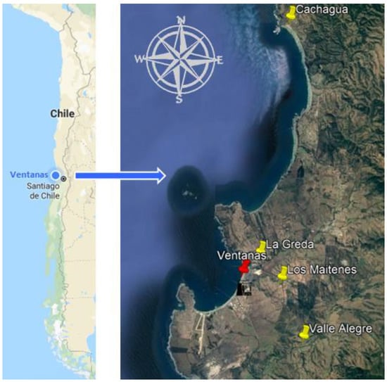 Three sampling points were selected for the present study: La Greda (LG) (32°45’14” S–71°28’17” W), Los Maitenes (LM) (32°46’20” S–71°28’13” W), and Valle Alegre (VA) (32°48’27” S–71°26’5” W), located 1.2 km NE, 1.5 km SE, and 6.5 km SE, respectively, from the industrial complex. Additional samples were collected in Cachagua (CH) (32°34’52” S–71°26’55” W), located 20.3 km N from Ventanas. These sites were selected according to previous soil contamination records [10,22] that may follow an expected concentration gradient pattern. La Greda and Los Maitenes are the nearest to the emission sources, and therefore, they are expected to be the most impacted sites. In contrast, Valle Alegre is located in an intermediate impact position, and Cachagua is the farthest location northwards and so is nearly unaffected by industrial impact (Figure 1).