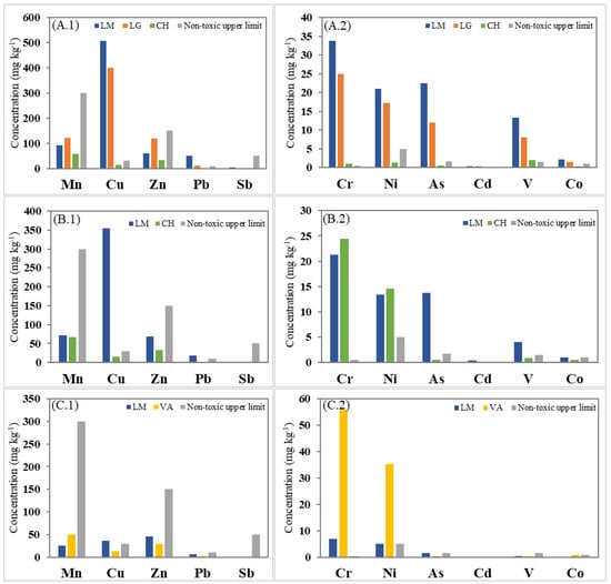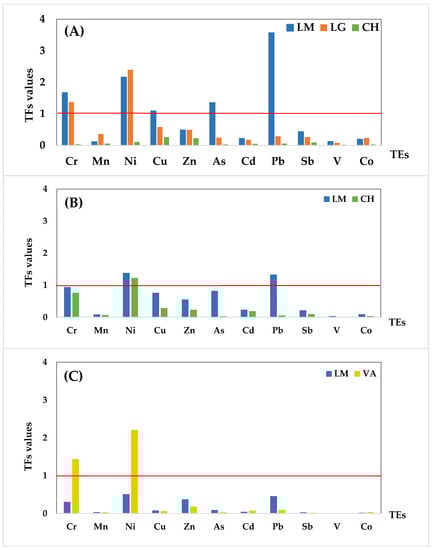 Figure 3A shows a general tendency for the TF values for most of the trace elements: LM > LG > CH, except for Mn, Ni, and Co, where the higher TF values in LG were not related to higher concentrations in soil. Concentrations in soil of Cu, Zn, As, and V are above the guideline values for the world in at least one of the studied locations, as mentioned in Table 3 and by previous works in this area [10]. Regarding the present TF results, O. picensis showed enrichment with Pb, Ni, Cr, As, and Cu (TFs > 1), as well as potential enrichment with Zn (TFs >0.5), so this species can be selected as a native plant for phytoremediation in highly polluted soils, especially in acidic soils with very low organic matter content, such as LM soils.