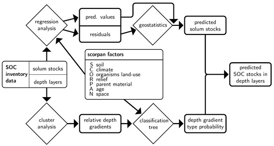 For the regionalisation of SOC stocks in the north-eastern lowlands, we started with the general methodology proposed by Kempen et al. [37]. The main accommodations to the requirements for mapping SOC in the north-eastern lowlands concern a simplified derivation of depth functions, which does not require expert-knowledge-based groupings like horizons and soil types. Additionally, we tried to facilitate the accessibility of the main factors controlling the horizontal and vertical distribution of SOC. To achieve this, we substituted soil-type-specific depth functions with data-driven clustering and split up the mapping process for the vertical and horizontal distribution of SOC with relative depth gradients. A flowchart of the methods and data involved is given in Figure 1.