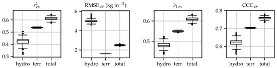 The assessment of random fluctuations due to the limited size of the calibration sample is shown in Figure 3. The cross-validation estimates of derived for the terrestrial soil models are in good agreement with the values obtained from the calibration sample. In the case of models for hydromorphic conditions, the agreement between the calibration sample and cross-validation estimates of is slightly poorer. In comparison to the cross-validation results for the group of terrestrial sites, the fluctuations of across the repetitions are distinctly higher for the hydromorphic sites. Quite similar relations can be discovered by inspecting and RMSE. The cross-validation estimates RMSE are almost as small as the respective calibration sample estimates . The fluctuation of RMSE across validation runs is nearly negligible. Again, the situation is different for the cross-validation estimates derived for hydromorphic sites, showing slightly increased values that vary substantially over the performed repetitions. Altogether, these observations are in line with the findings of Browne [70] regarding the use of cross-validation in regression applications: If the calibration sample is sufficiently large, the model performance measures yielded by calibration and cross-validation are essentially the same. On the other hand, the cross-validation clearly unveils the slightly optimistic impression of model performance that was originally derived for the small sample of hydromorphic sites. The indicators and CCC adopted from assay and instrument validation also reflect this dependence on sample size. By definition, the slope between the observed and predicted values equals the coefficient of determination when this performance measure is used in conjunction with regression analysis (applies to the calibration sample).