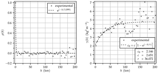 For modelling the variogram, we selected an exponential function with an additional nugget component (Figure 4). The range for fitting the function to the experimental values was restricted to 100 km, thus neglecting the hole effect at larger lag distances. Following Webster and Oliver [75], we did not fit the variogram model to the hole effect, as there was no clear theory for the observed periodicity. In addition, the use of increased weight factors at high distances in the kriging procedure would not support the desired incorporation of unknown large-scale effects. The combined variogram model achieved a high goodness of fit (R2 = 0.874). The parameters estimated using the Levenberg–Marquardt method [94] indicate that pairs of residuals are spatially correlated up to a distance of 108 km (ca 3 ) until the model approaches the maximum semivariance (sill c). However, nearly half of the spatially dependent variation occurs at distances below the lag increment or is contributed by measurement errors, as can be seen from the fairly high nugget component [90].