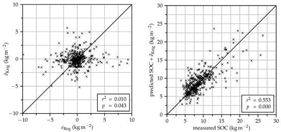Scatter diagrams of residuals retained from regression analysis against residuals estimated by ordinary kriging and measured SOC stocks versus predictions improved by kriging estimates of residuals obtained during leave-one-out cross-validation.