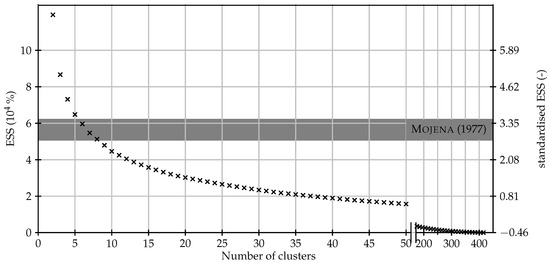 Increase in the error sum of squares (ESS) with a decreasing number of clusters during hierarchical grouping of depth gradients. The grey bar indicates the range of standardised ESS according to the stopping rule of Mojena [78].