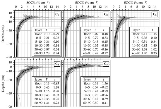 The plotted depth gradients (Figure 7) show a reasonable homogeneity. The assessment of within-group variability by the computed F-statistics supports this impression: Overall, with F-statistics below 1 in the majority of cases, the obtained clusters can be considered as homogeneous ([77], p. 447). The ‘mor humus cluster’ C5 is by far the most homogeneous cluster. The occurrence of increased F-statistics is limited to deeper soil layers. Due to the small proportions of SOC stored in these depth increments, the higher variability can be widely neglected. In fact, the increased F-statistics within the deeper layers can be seen as a result of the equally weighted distances used for hierarchical grouping. Compared to the variability observed within the upper parts of the soil, also these layers are very homogeneous, as shown by the line graphs in Figure 7.