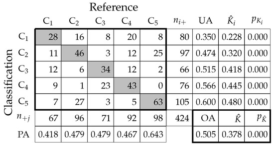 In addition to assessing the accuracy of the tree predictions with risks and , based on the node impurities and, hence, expressing the risk for erroneous class probabilities, we also computed the error matrix of Congalton and Green [98]. For building the error matrix, we used the most frequent cluster within the individual terminal nodes of the tree for classifications (Figure 10). As one might expect, the p-values clearly show that the classifications of each individual cluster (), as well as for the entire error matrix (), are significantly better than random results. Referring to the nomenclature of Landis and Koch [99], the relative strength of agreement associated with the derived values of conditional KHAT statistic can be considered as moderate in the majority of cases (KHAT is an estimate of Kappa). The classification achieved at least fair accordances for any of the clusters. For the overall classification, also indicates a fair strength of agreement between the reference and classified data. The poorest results in terms of are produced for cluster . This can be seen as a result of the anthropogenic origin assumed for this depth gradient, making predictions challenging. In total, the hit rate of the classification tree expressed by overall accuracy (OA) slightly exceeds 50%. The depth gradient with the highest individual hit rates (producer’s accuracy (PA) and user’s accuracy (UA)) is the most frequently observed cluster C5, which is common in mature pine stands on sandy soils. The ratios of row- () and column-sums () are reasonably balanced, so the predictions are unbiased and no depth gradient is over-predicted.