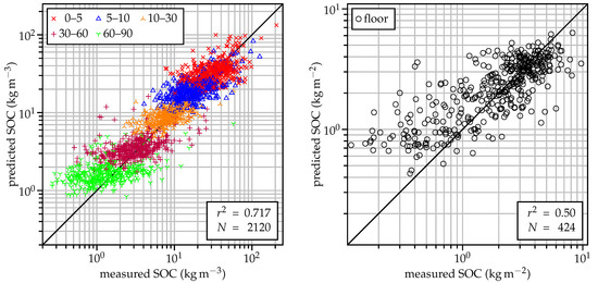 The model performance measures are given in Figure 2. As expected, the p-values derived from the F-distribution signal high significance. The number of explanatory variables J entered into both equations is distinctly below the threshold of 10 N/J that was recommended by Hengl et al. [38] to prevent overfitting. Particularly in terms of absolute errors, the norm of residuals confirms that the performance of the groundwater submodel is slightly poorer. The increased differences in this domain can also be seen clearly from the scatter plot of the measured and predicted values (Figure 2). These differences between both submodels mainly result from the high variability of SOC in the group of soils with near-surface groundwater. Thus, the coefficients of determination, and , are quite similar in both models. The scatter plot shows no extreme outliers or systematic deviations. Merely by viewing the data of both models at once, some heteroscedasticity appears. Within the single models, though, the observed overall heteroscedasticity has no effect on the estimation of confidence intervals [77].