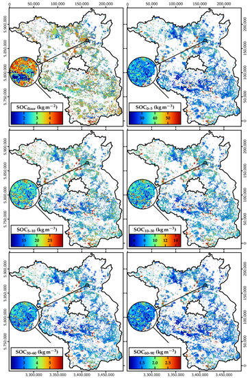 - Collard, F.; Saby, N.; Richer de Forges, A.; Lehmann, S.; Paroissien, J.B.; Arrouays, D. Spatial prediction of soil organic carbon at different depths using digital soil mapping. In GlobalSoilMap—Basis of the Global Spatial Soil Information System; Arrounays, D., McKenzie, N., Hempel, J., Richer de Forges, A., McBratney, A.B., Eds.; CRC Press; Taylor & Francis Group: Boca Raton, FL, USA, 2014; pp. 181–184. [Google Scholar] [CrossRef]