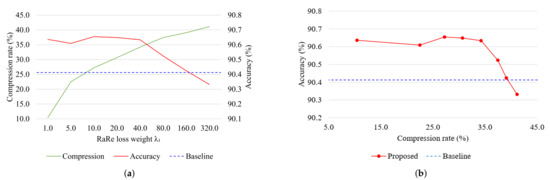 (a) The change in compression rate and accuracy with varying values of . (b) Test set accuracy plotted as a function of compression rate. The compression rate of the baseline model is 0% and its accuracy is plotted in black dashed