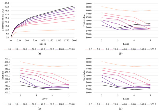 Characteristics of model compression with different values of . (a) The compression rate of the proposed method over the course of training. (b–d) Feature space, input, and output dimension of each layer after training is finished.