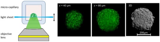 3D imaging of CHO-pAcGFP1-Memcell spheroids with membrane-associated Green Fluorescent Protein (GFP). Light Sheet Fluorescence Microscopy (LSFM) using rectangular micro-capillaries (scheme, two single planes and 3D reconstruction); beam waist: Δz = 5–10 µm, focal depth: Δy = 100–200 µm (reproduced from Ref. [] with modifications).