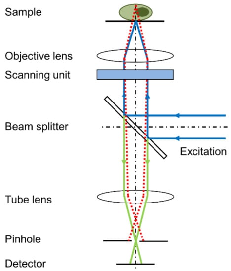 Principle of a confocal laser scanning microscope (CLSM); only a confocal beam passes the pinhole, while non-confocal beams are blocked (reproduced from Ref. [] with modifications).