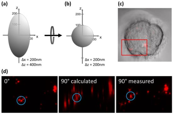 Most microscopy techniques can also be combined with axial tomography, where a sample embedded in a micro-tube or capillary is rotated and observed from various directions []. The advantage of this technique is demonstrated in Figure 5, showing an MCF-7 breast cancer cell incubated with quantum dots of about 20 nm in size (Figure 5c). Each dot is represented by a point spread function, as depicted in Figure 5a. In a side view at 90° (calculated from a z-stack recorded at 0°), the quantum dots appear blurred (reflecting the low axial resolution of the microscope), but after mechanical rotation through 90°, they appear clear and well resolved (Figure 5d). Thus, axial tomography provides an isotropic high resolution, as depicted in Figure 5b.