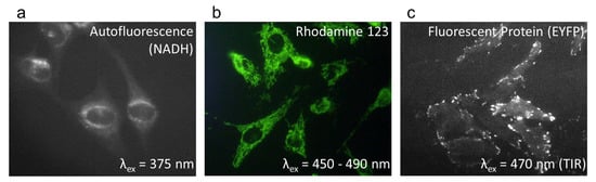 Cells are commonly cultivated as two-dimensional (2D) monolayers on glass or plastic slides and are readily assessed by wide-field as well as by laser scanning microscopy. In some cases, they may provide results of limited significance due to nonphysiological conditions that directly affect relevant parameters (e.g., resistance to drugs). Conventional wide-field microscopy can be used for fluorescence or light scattering experiments, if the information originates from thin cell layers of only a few micrometers, e.g., autofluorescence measurements (Figure 6a) or fluorescence measurements of dye-staining organelles, e.g., mitochondria (Figure 6b). However, for a numerical aperture AN = 0.75 (typical for a 40× magnifying objective lens), the depth of focus Δz = nλ/AN2 is less than 1 micrometer, so confocal laser scanning microscopy (CLSM) may be advantageous even for experiments concerning cell monolayers, when high axial resolution is required. Total-Internal-Reflection Microscopy (TIRFM), with an evanescent electromagnetic wave penetrating about 100 nm into a cell, is an appropriate wide-field method for measuring the surface of 2D cell cultures, e.g., for studies of their plasma membrane or membrane proximal sites. An example is given in Figure 6c for Enhanced Yellow Fluorescent Protein (EYFP) linked to Paxilline in focal adhesions, which are relevant for cell–substrate interactions.