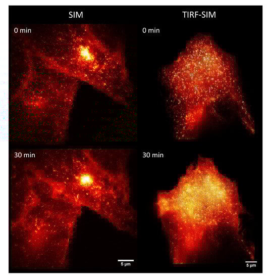 Previously, TIRFM has been combined with super-resolution or super-localization microscopy, e.g., for selection of thin layers for single-molecule detection. There are also reports in the literature on a combination of TIRFM with SIM, when two interfering laser beams are focused close to the edge of the aperture of high-AN objective lenses (AN ≥ 1.45), so that they are totally reflected on the sample [,,]. In this case, high lateral and high axial resolution are combined on the surface of a specimen, resulting in an isotropic resolution of around 100 nm. An example is given in Figure 7 for the stimulus-dependent translocation of the glucose transporter GLUT4 (fused with green Fluorescent Protein, GFP) from intracellular storage compartments to the plasma membrane. Insulin or the insulin-mimetic phytochemical compounds tannic acid, as well as Bellis perennis extract, were used as stimulating agents []. As depicted in Figure 7 (left), we observed fluorescence arising from small vesicles and—in particular, after stimulation—from larger areas within the plasma membrane by SIM. When we measured the plasma membrane almost exclusively by SIM-TIRFM (Figure 7, right), we observed a pronounced increase in fluorescence over the whole cell surface after stimulation.