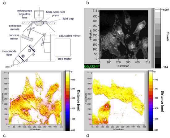 Based on the fact that the penetration depth d(Θ) of the evanescent electromagnetic wave depends on the angle of incidence Θ, we previously calculated the fluorescence intensity of the TIRFM signal for a homogenously fluorescent layer of thickness t as IF (Θ) = A T(Θ) t e-Δ/d(Θ) with a constant A, a transmission factor T(Θ) through the cell–substrate interface, and a distance Δ between a cell and its substrate []. Variation of the angle Θ (variable-angle TIRFM) permitted imaging of this distance Δ for the whole specimen (cell–substrate topology). An illumination device (microscope condenser) for variable-angle TIRFM is depicted in Figure 8a, and its applications in Figure 8b–d. Here, the fluorescence of the membrane marker laurdan in U251-MG glioblastoma cells is depicted upon excitation at Θ = 66° (Figure 8b), and the cell–substrate topology is calculated for cells with activated tumor suppressor gene TP53 (“less malignant cells,” Figure 8c), as well as for wild-type tumor cells (Figure 8d). Obviously, the less malignant cells showed variable distances Δ between about 100 and 300 nm (“folded surface”), whereas the tumor cells showed a homogeneous distance of Δ ≈ 100 nm (“unfolded surface”). Therefore, cell–substrate topology seems to be a criterion to distinguish between tumor cells and less malignant cells [].