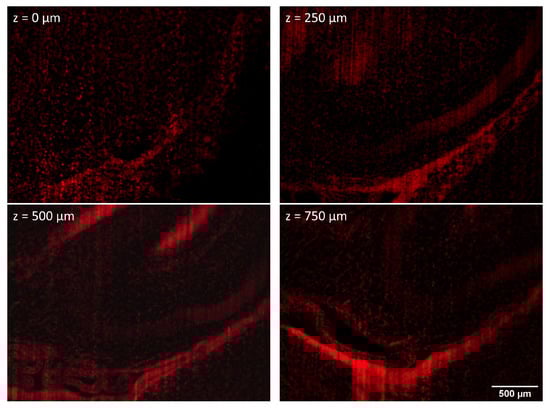 Biopsies from a histological laboratory are often stained with specific dyes for certain organelles to enhance contrast. Light scattering is a major problem for imaging deeper layers of cell assemblies or biopsies, limiting penetration depths typically to 100 µm or less. Optical clearing techniques matching the refractive indices of tissue and surrounding aqueous medium have gained considerable importance for deep view imaging of the skin, brain, and other organs [,,]. Currently available optical clearing techniques are not compatible with live cell imaging; however, efforts are being made to find biocompatible solutions, especially for ex-vivo applications []. While penetration depths are limited to 100–200 µm in noncleared samples, they can be even larger than 0.5 mm in cleared samples. An example is given in Figure 10 for stained biopsies of the mouse brain. In an approach toward super-resolution microscopy, optical clearing is combined with Expansion Microscopy (ExM) (for a review, see []), where the sample is physically expanded using swellable charged polymers to gain nanoscale resolution. It has a wide range of applications in cell and developmental biology, but in most cases, is not compatible with life cell imaging.