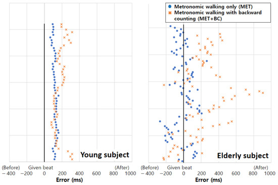 This study determined the temporal errors of heel contact from the presentation of the metronome beat in the elderly and young adults. In addition, differences in between-group and within-group temporal errors when performing additional cognitive tasks were studied. The results revealed that there were significant differences in mean and CV of the temporal errors between the young adults and the elderly under both gait conditions. Furthermore, the mean temporal errors under MET and MET + BC conditions within each group were significantly increased in both young adults (MET: 128.8 ± 29.0 ms; MET + BC: 200.2 ± 37.0 ms) and the elderly (MET: 156.9 ± 52.2 ms; MET + BC: 351.0 ± 153.9 ms). However, while the CV of the temporal errors in the elderly was significantly higher under MET + BC conditions than under MET conditions (102.4 ± 54.0% and 50.8 ± 22.5%, respectively), the CVs in the young adult group did not change under both conditions (26.9 ± 8.0% and 23.9 ± 8.9%, respectively).